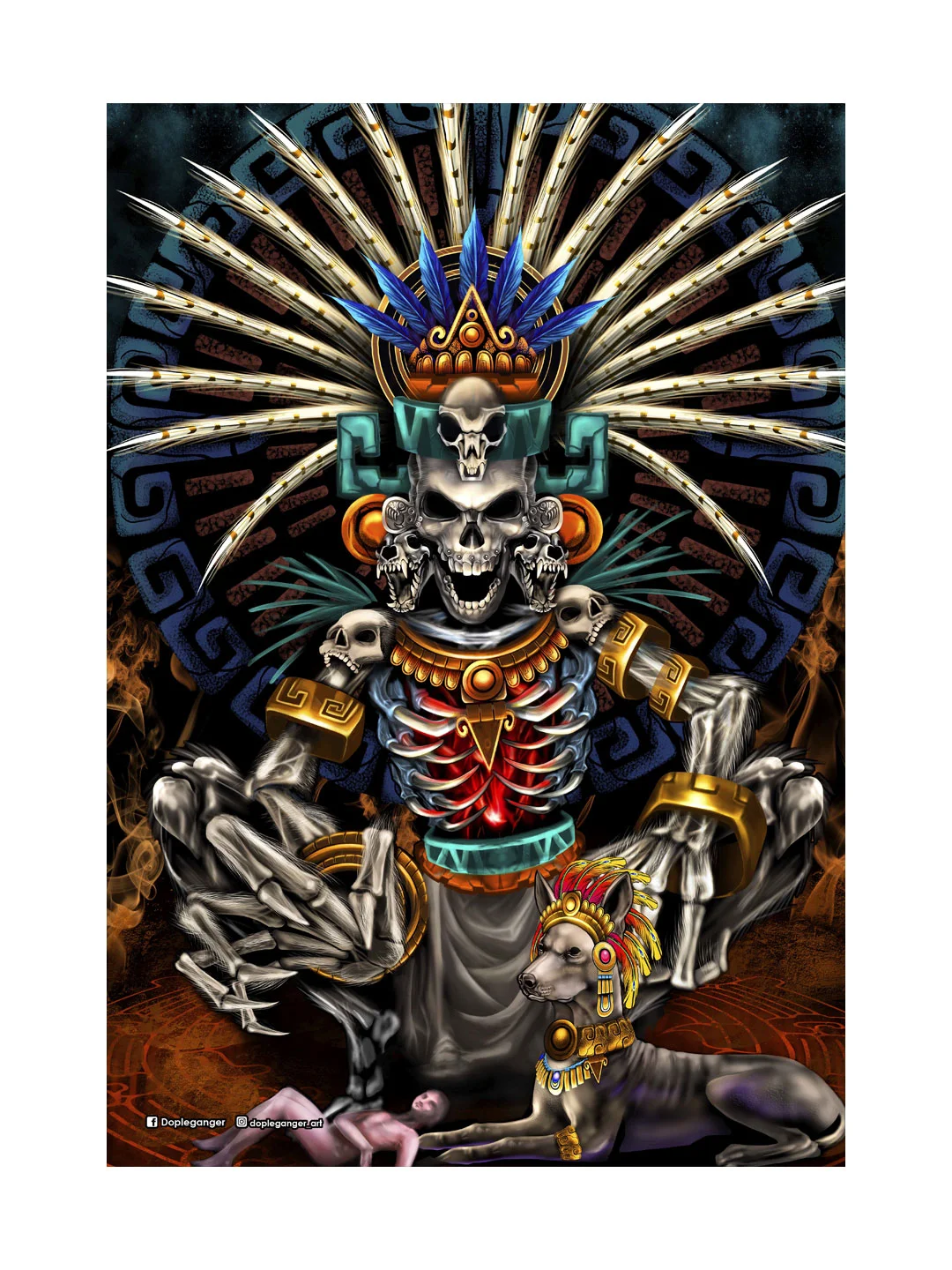 Mictlantecutli: Dios del Mictlán o inframundo, señor de las sombras y regente de los nueve ríos subterraneos y junto a Xoloitzcuintle quien debía ver si el muerto había sido digno en vida, en otras palabras, si había sido bueno con los perros, en caso de