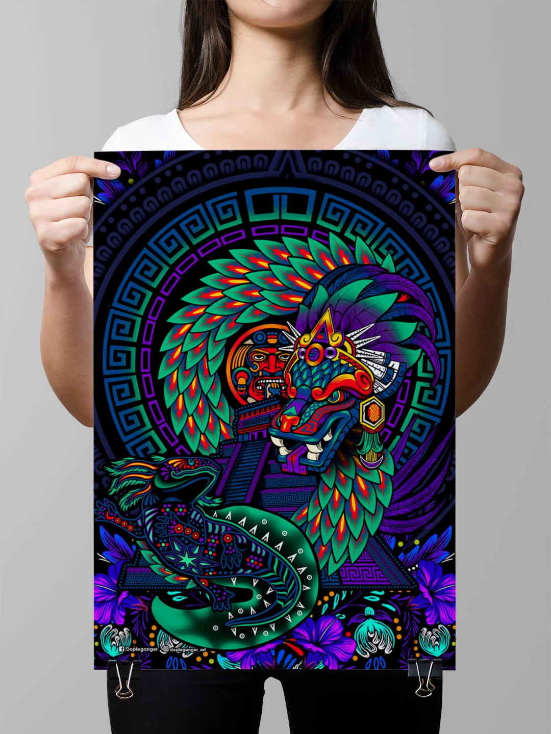Ilustración basada en la leyenda en Quetzalcóalt y el Ajolote, a grandes rasgos, el Dios Axolotl escapó de un ritual en donde se requeria inmolarse, éste huyó a los mares donde Quetzalcóatl lo encontró y lo llevó de regreso donde ahora si no escaparía del ritual.