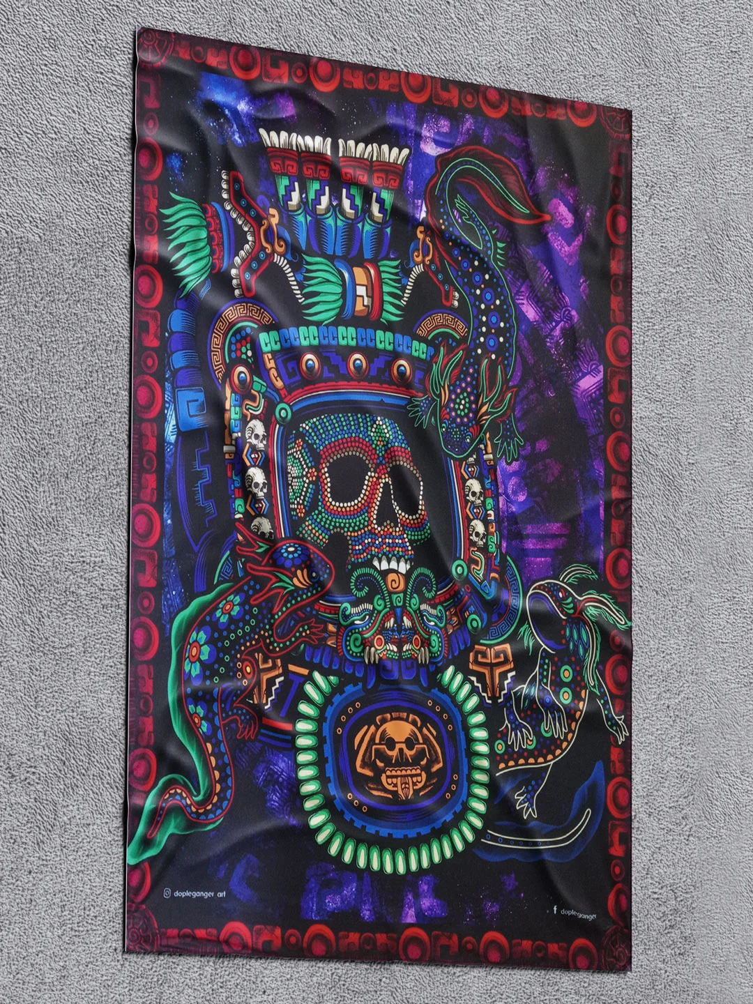 Esta ilustración es de una Calavera astronauta y esta inspirada en la escultura de la escafandra del astronauta azteca donde se encuentra a unos ajolotes cósmicos, no confundir con Pakal.