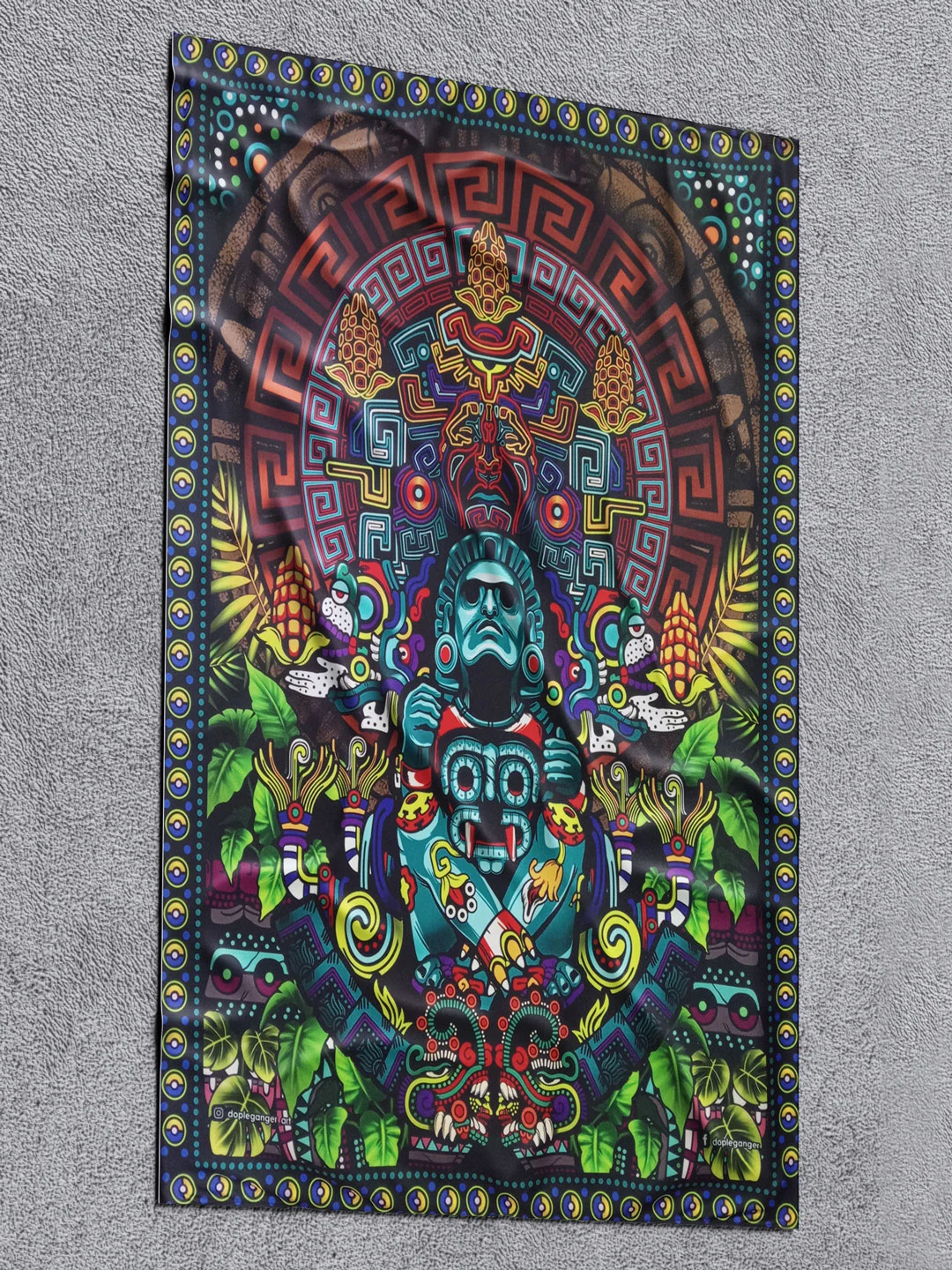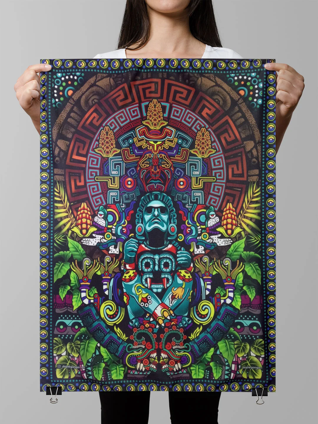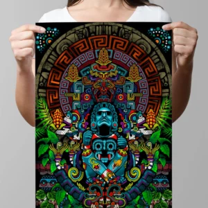 Ilustracion basada en la trinidad de los dioses aztecas (Tláloc, Dios de la lluvia, Xochipilli, Dios del amor y Cinteotl, Dios del maíz) muy importantes en la cultura azteca